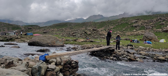To add another boost for adrenaline junkies, on the last day we crossed a high speed flowing glacial river originating from Gangabal Lake on a thin plank. Imagine the vibrating plank and the site of rapids flowing underneath the bridge. This can easily make you dizzy while crossing (check out the video below). Needless to say the locals did this seamlessly and made us look like babies. Takeshi's Castle in action! However, we're proud to say we both did it, although slowly, without assistance and came out alive.